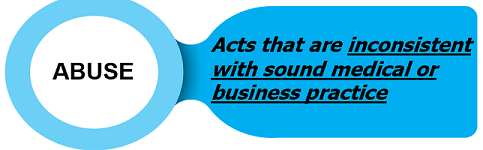 - ABUSE is when services delivered are inconsistent with sound fiscal, business, or medical practices, or fails to meet professionally recognized standards that results in claims with no legal entitlement thereto. However, the individual or entity’s lacks intention to misrepresent the facts to obtain payment. Examples are: