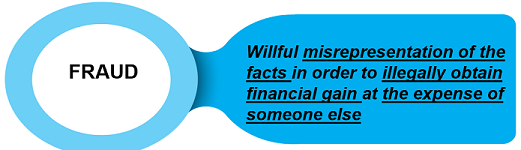 - Fraud is defined as the unlawful and intentional making of a misrepresentation which causes actual or potential prejudice to another.” CR Snyman (1984)